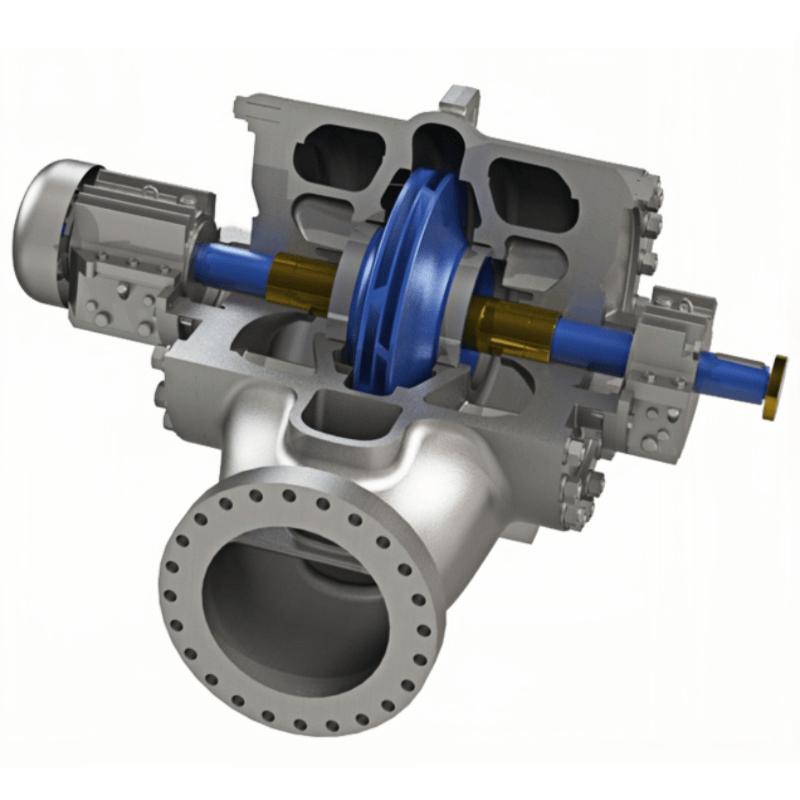 Double-suction impeller with low NPSHr (Net Positive Suction Head required), excellent cavitation resistance, high flow capacity, and high efficiency. Its performance curve allows for a wide operating range and a broad high-efficiency zone, providing extensive selection flexibility. The double-suction structure of the impeller ensures self-balancing of axial forces, while the residual axial thrust is absorbed by an angular contact ball bearing on the non-drive end, ensuring smooth and stable operation.