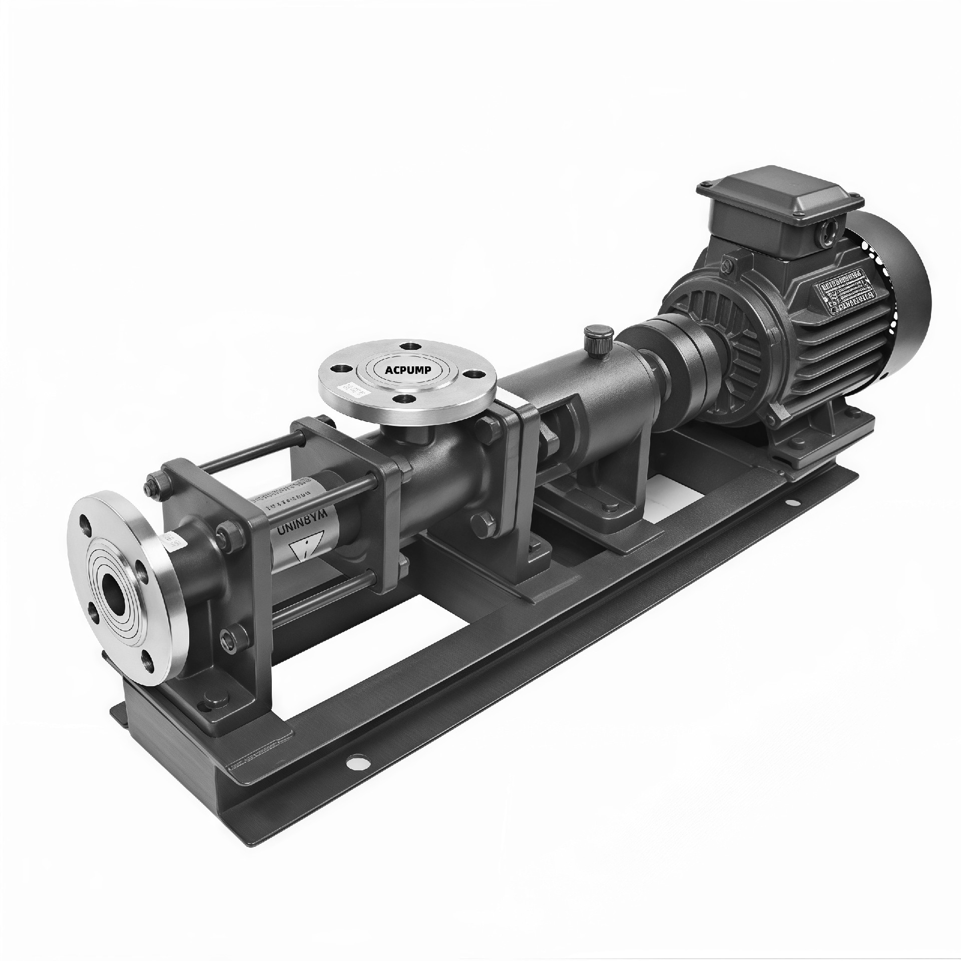 The G-type single screw pump is a positive displacement pump derived from the Archimedes screw pump. It relies on the meshing of the screw shaft (rotor) and the rubber sleeve (stator). When the power end drives the rotor via a universal joint to rotate around the stator center, the rotor and stator continuously engage to form vacuum chambers. These vacuum chambers move axially at a constant speed, transporting the conveyed medium from the inlet to the outlet. The medium drawn into the vacuum chambers flows through the stator without being agitated or damaged. AC Pump Industry's G-type stainless steel screw pump exhibits strong adaptability to various media, stable flow rates, and virtually pulsation-free pressure.